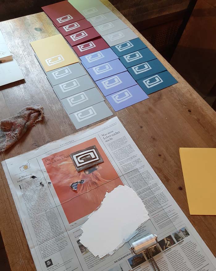 bunte Umschläge mit Linoldruck gestaltet, in Leporelloform